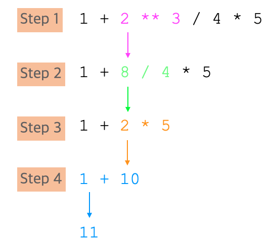 We have no parenthesis here. Of course, if we had parenthesis this would have been less complicated. We do have exponentiation, that is two to the power three, denoted with a double asterisk. It should be evaluated first as it is the highest priority operation we find in this example. The result of step one is eight. Then in step two, we have both multiplication and division which are similar in priority level. So we apply the left-to-right rule and we find division before multiplication. So, in step two we divide eight by four resulting in two. Step 3 is straightforward, as we will do multiplication before addition, which results in ten. And at the last step, we only have addition to perform and the final result is eleven. Note that Python will do all these operations for you, in the correct order.